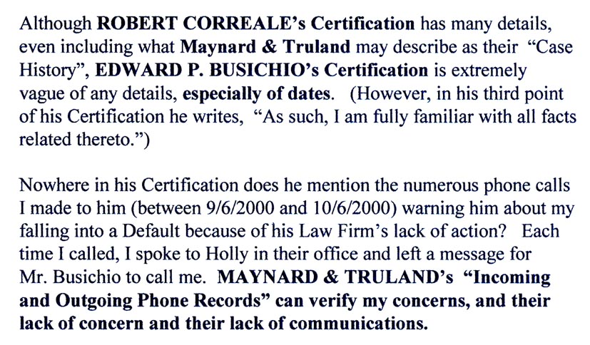 On December 21, 2000, I first wrote a letter to the New Jersey Supreme Court's Office of Attorney Ethics complaining about the Maynard & Truland law firm in Morristown, New Jersey and their attorney Robert Correale.   Maynard & Truland was a law firm that I retained to represent me in a Superior court case.  We were four months into the contract, so I did not want to change the law firm; I just wanted Maynard & Truland and their attorney Robert Correale to act professionally.  My complaints in the letter were Maynard & Truland's complete lack of professionalism, which included their gross negligence, their (Correale) overcharging me, their (Correale) false billing, their (Correale) inability to have me removed from a court default that they caused themselves and their (Correale) complete lack of communications.  I no longer wanted to feel like I was fighting Maynard & Truland and their attorney Robert Correale, more than the real opposing parties.