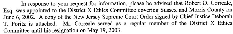 Back in March 2003, Jack copied Robert Correale's law firm description of his background directly from their website.  The above recent letter from the New Jersey Supreme Court states that Robert Correale was a regular member of Attorney Ethics, yet his firm's website lists him as the Vice-Chairman.