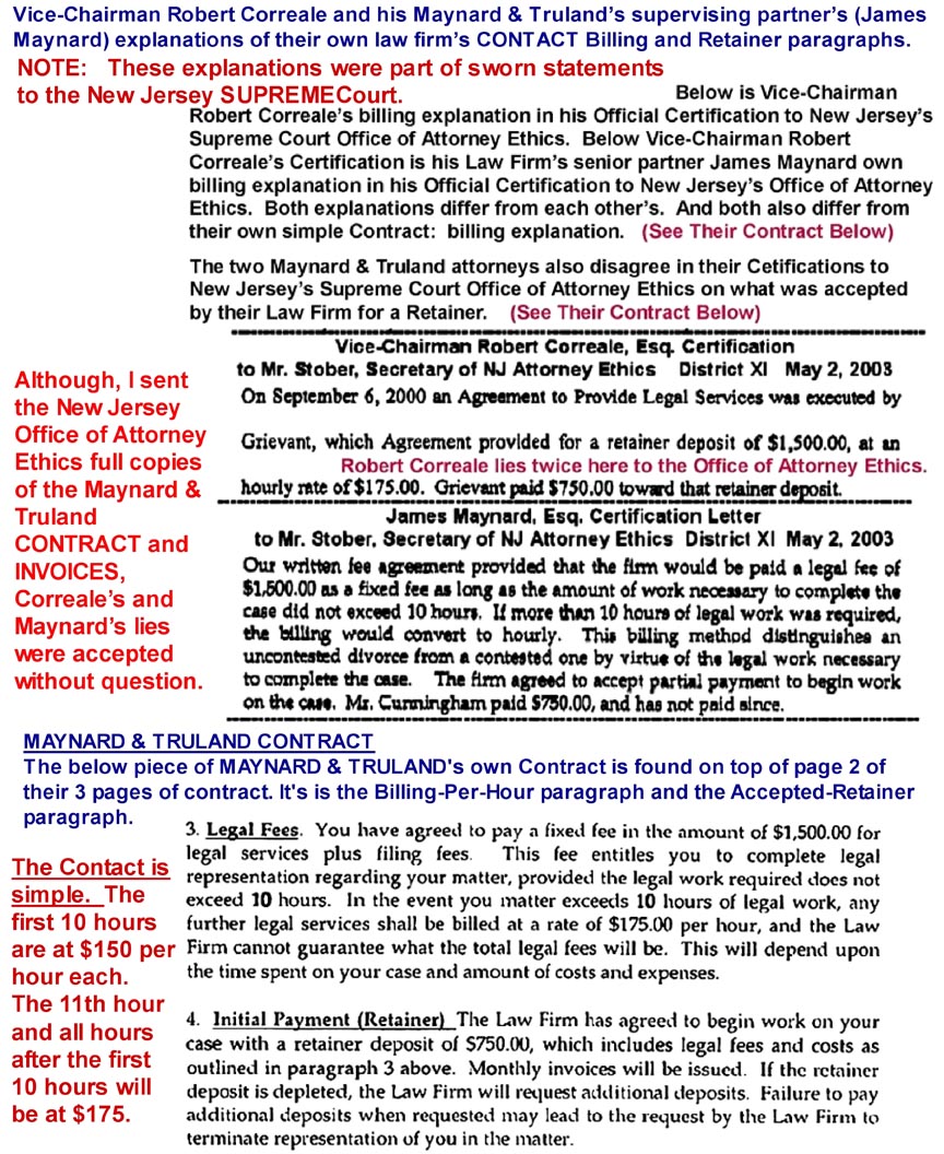 A little over two years later, when I refused to pay their open bill, Maynard & Truland attorneys brought me to Superior court for $1,700.  I counter sued on the same docket for Legal Malpractice against the firm.  During a break in the court proceedings, I learned that the Maynard & Truland attorney Robert Correale was the local Vice Chairman of New Jersey's Supreme Court Office of Attorney Ethics.  He was himself responsible for bringing official ethics violations to New Jersey's Supreme Court for himself and his law firm, Maynard & Truland.  This was the same Attorney Ethics Committee that I asked to support me two years before.  (Major Conflict of Interest)